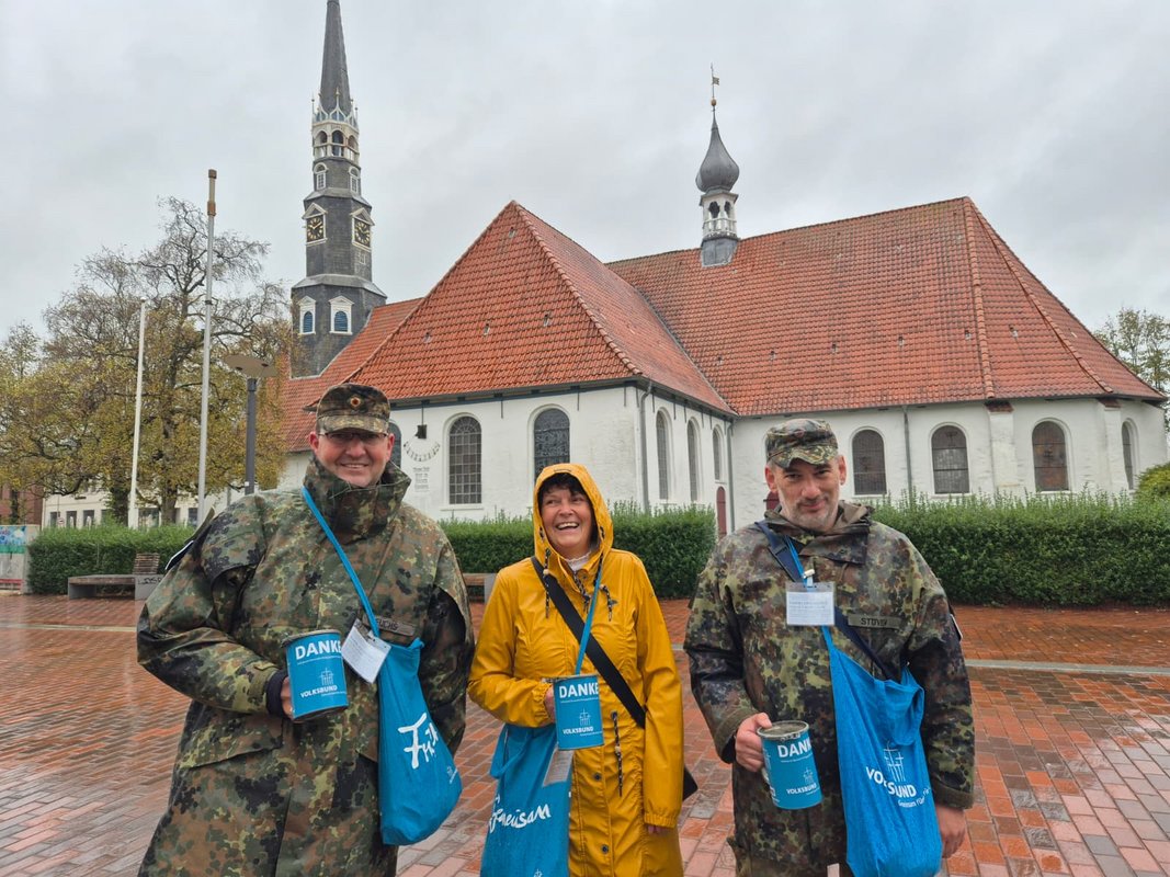 Zum Auftakt der diesjährigen Sammlung, am Samstag, den 25. Oktober, trotzten Kreispräsidentin Ute Borwieck-Dethlefs, der Standortälteste und Kommandeur II./USLw, Oberstleutnant Martin Fuchs, sowie Stabsbootsmann Stefan Stöven dem stürmisch-regnerischen Wetter und machten sich gemeinsam auf den Weg über den Heider Wochenmarkt. Zwischen Marktständen und regenschirmbewaffneten Passantinnen und Passanten kamen sie mit Bürgerinnen und Bürgern ins Gespräch – sowohl mit älteren Menschen, die aus eigener Familiengeschichte von den Folgen des Krieges erzählten, als auch mit jüngeren, die spontan spendeten.
